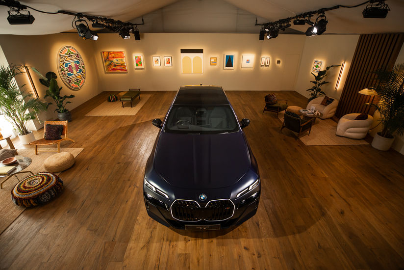 Chris created a shareable space at Freize Festival London where three worlds meet: Esther Mahlangu's latest iconic Art Car, the all-electric BMW i7, and Russell Tovey’s art-filled home style.